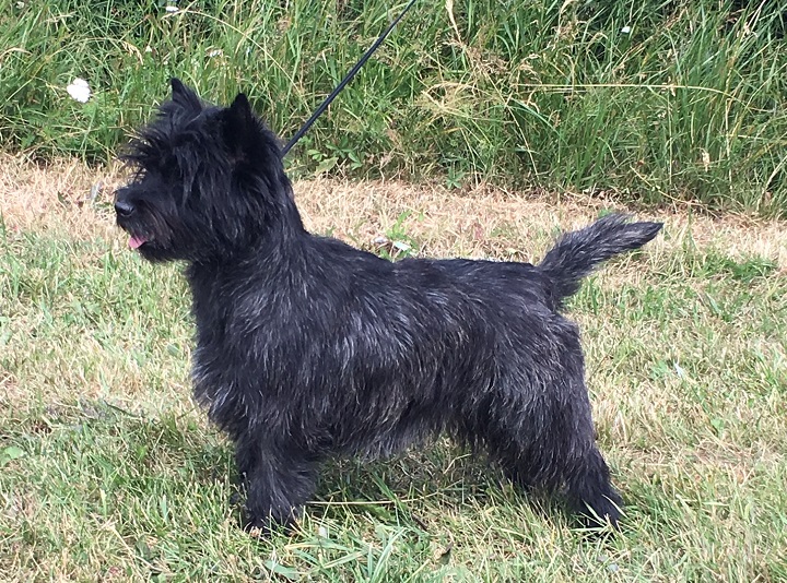 (Good size. Nice feminine head. Correct bite, ears and eyes. Slightly short neck. Good shoulder and upper arm. Suitable bone structure. Thick pads. Strong back. Good hindquarter angulation. Well carried and set tail. Excellent harsh coat. Nicely presented. Moves well all around. Excellent temperament.)
